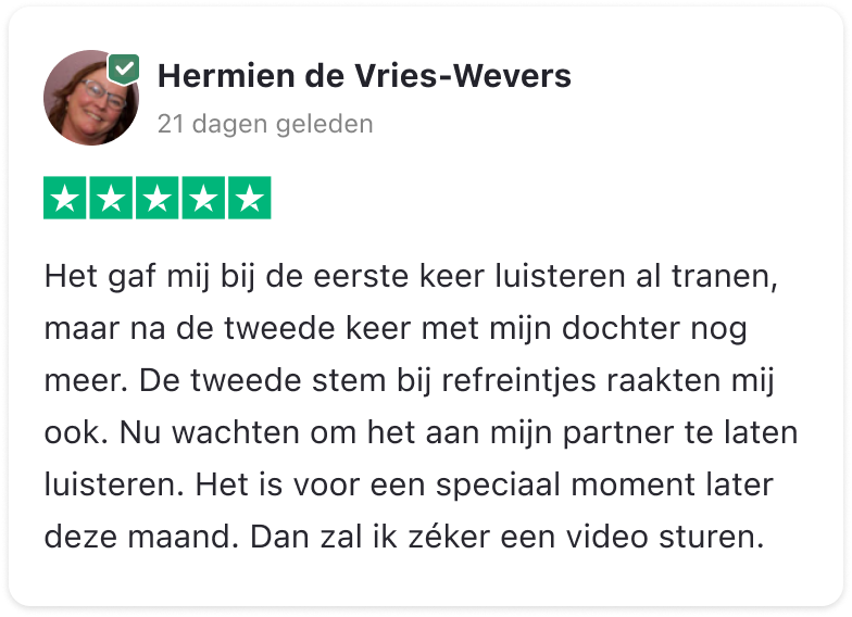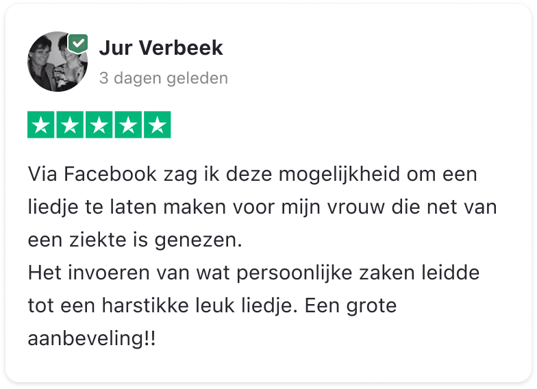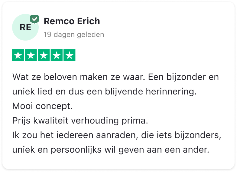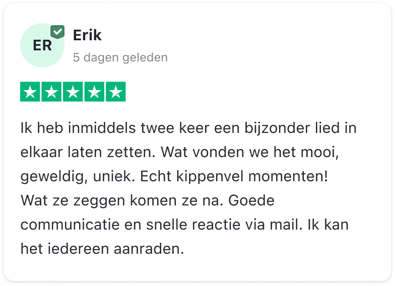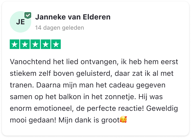 Met liefde en plezier zetten we jouw herinneringen, emoties en bijzondere momenten om in muziek die raakt. Of het nu gaat om een verjaardag, een bruiloft, een jubileum of gewoon om iemand te verrassen, wij maken van jouw verhaal een blijvende herinnering.