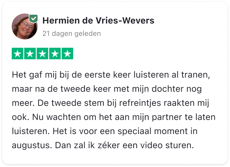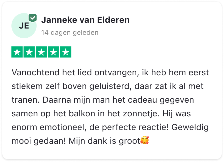 Bekijk hoe meer dan 10.000+ tevreden klanten reageren op hun persoonlijke lied — momenten van kippenvel, tranen en pure emotie.