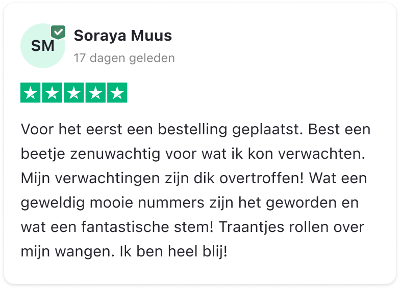 We doen ons uiterste best om ervoor te zorgen dat je 100% tevreden bent met jouw nummer. Als er iets aangepast moet worden, werken we graag met je samen om een oplossing te vinden die aan je verwachtingen voldoet. Jouw tevredenheid staat bij ons voorop!